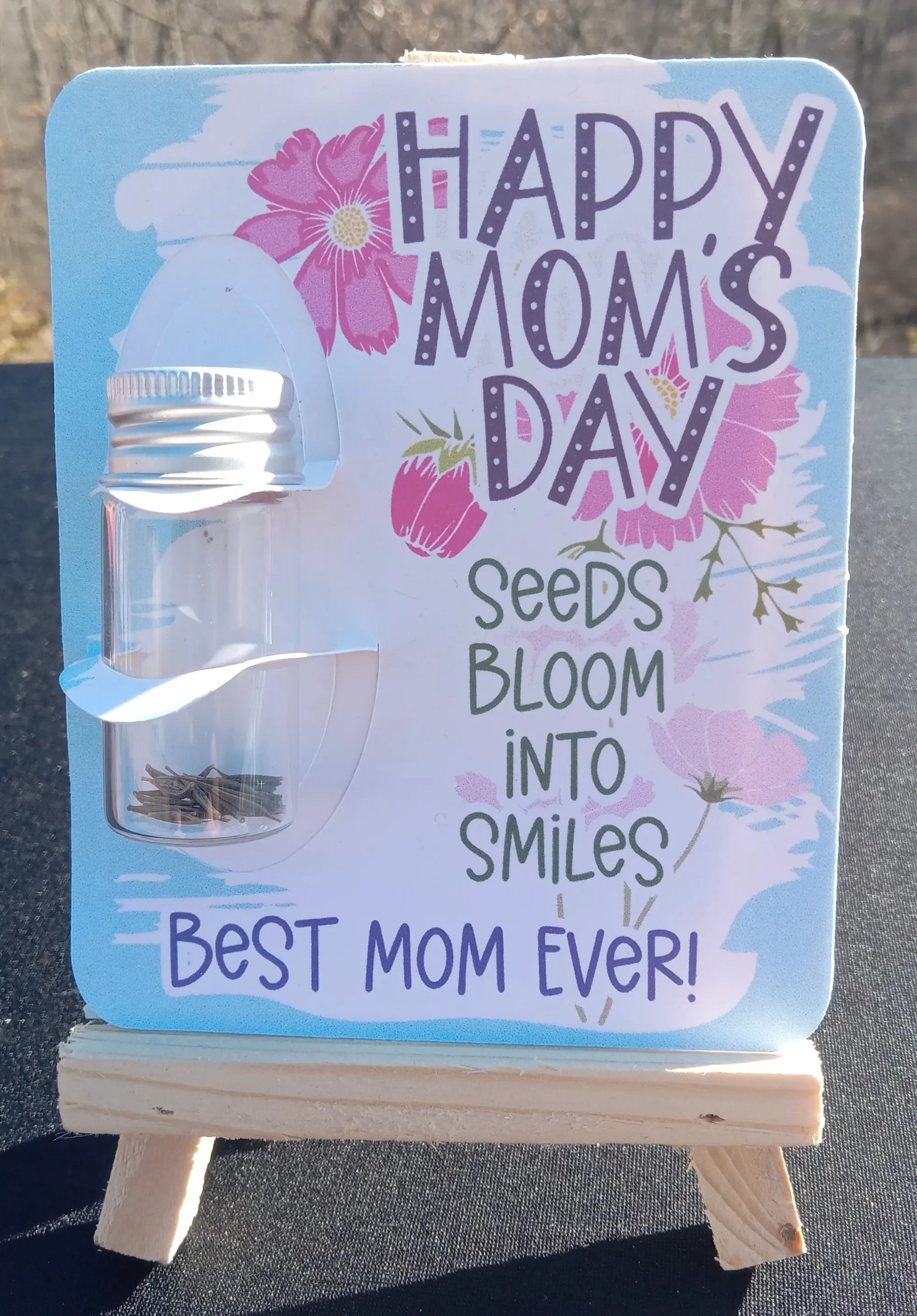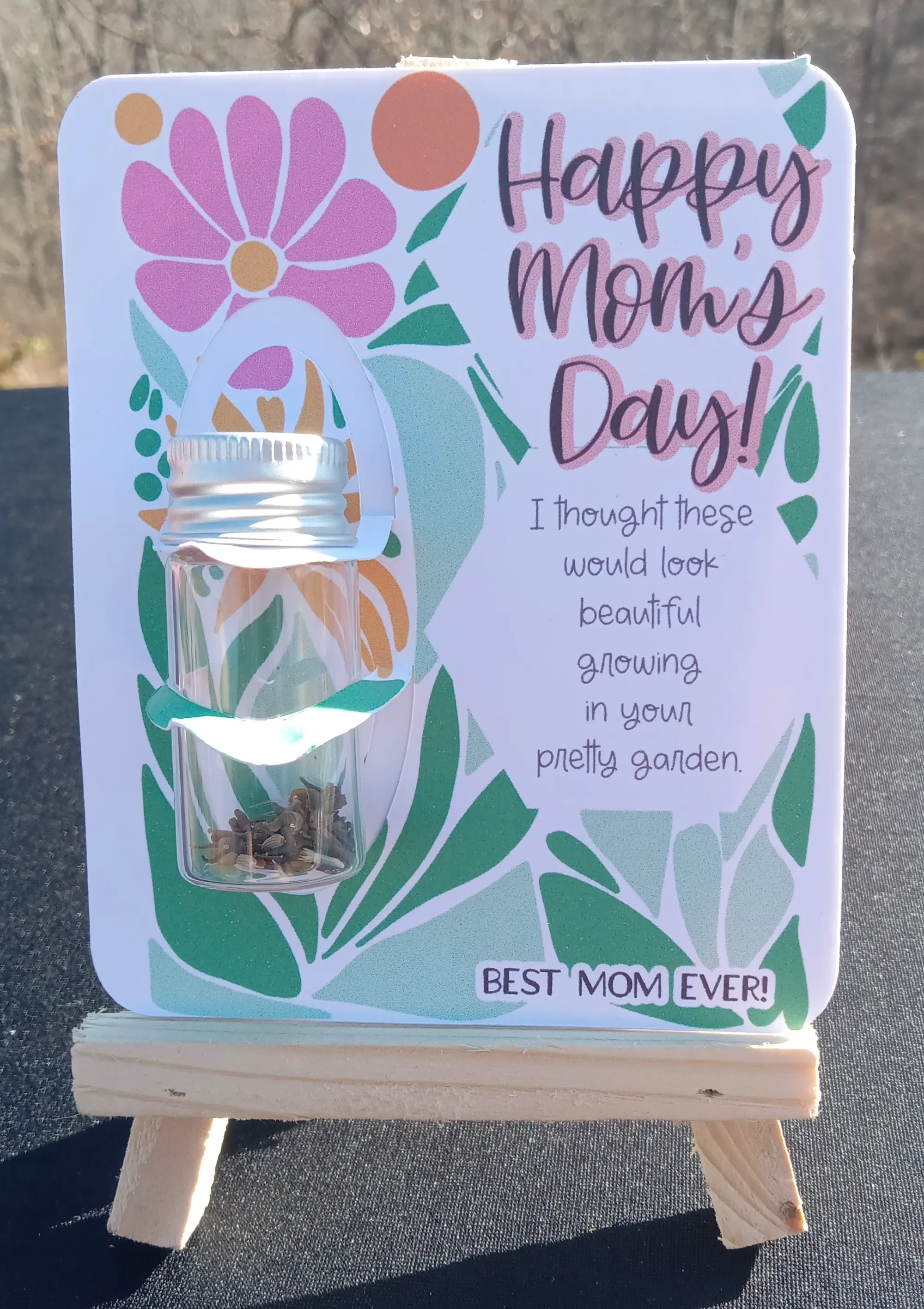 The perfect gift for Mom's special day! The card is 4"x5", the jar contains flower seeds, the original seed package is included for identification and care.