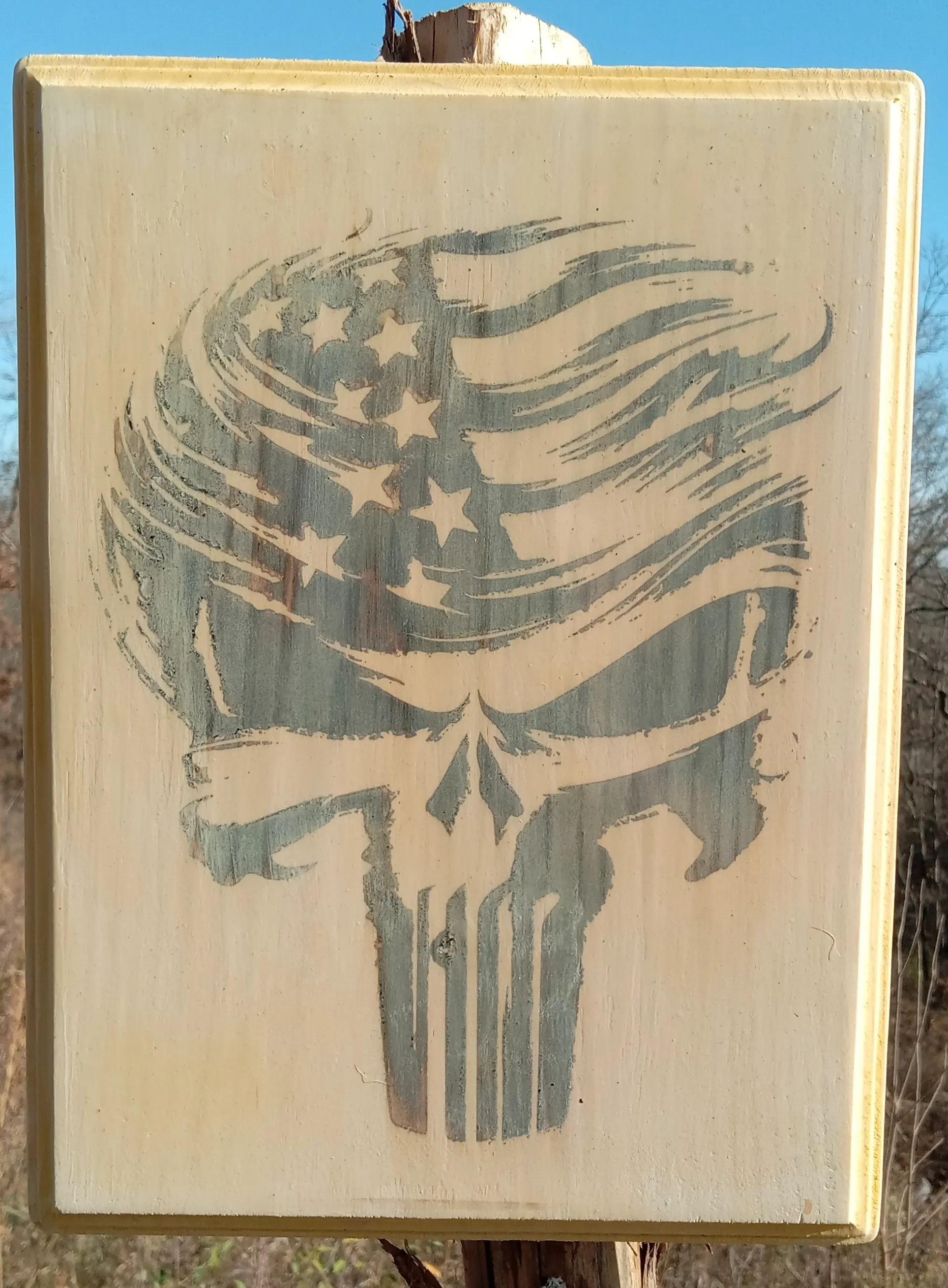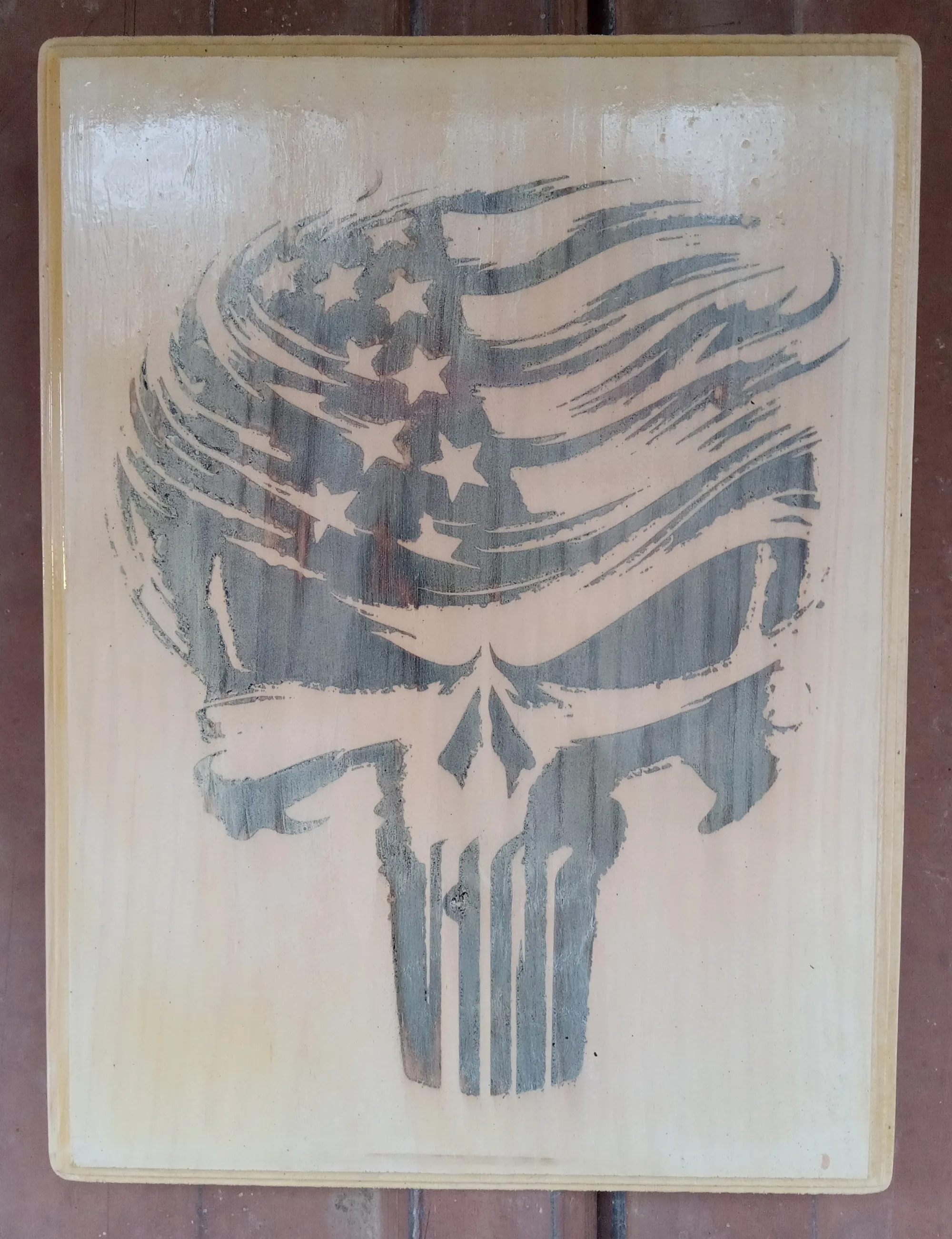 Punisher burned into white stained wood with glossy finish and hanging hardware installed.