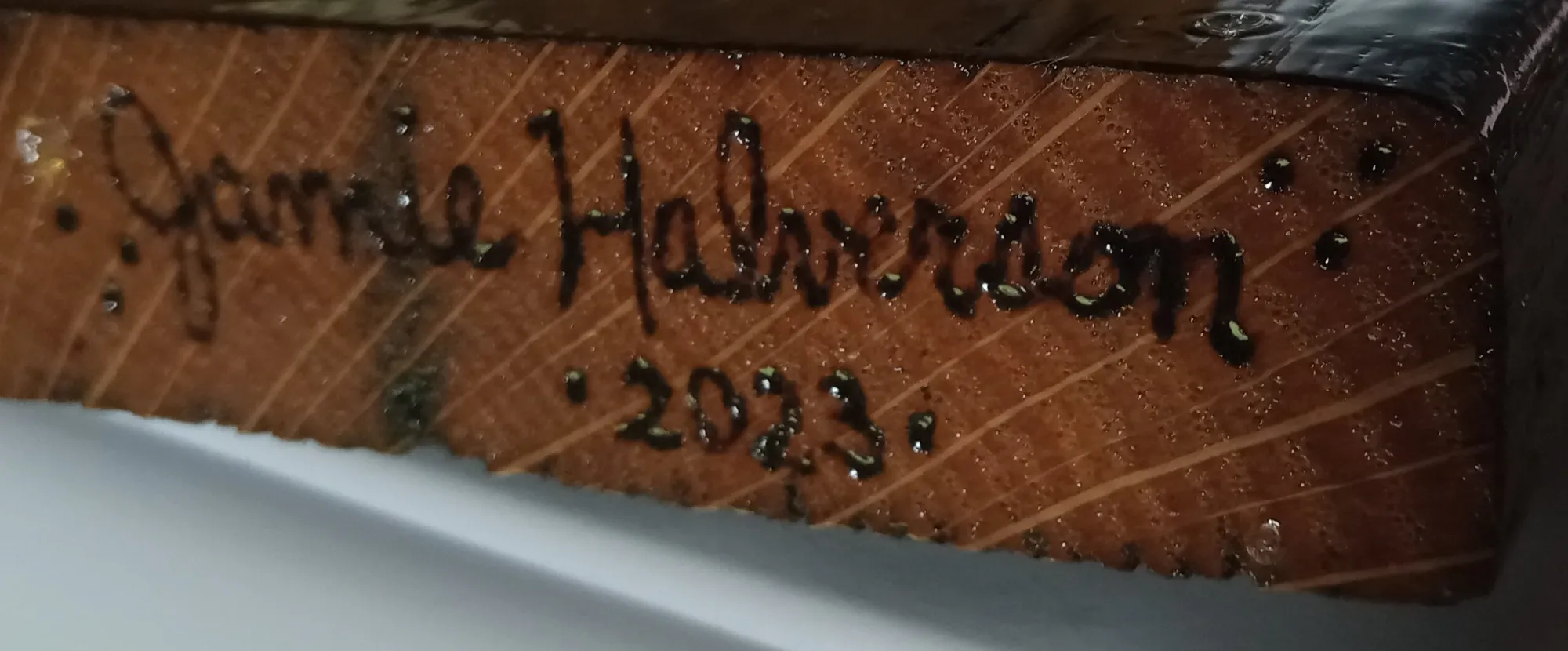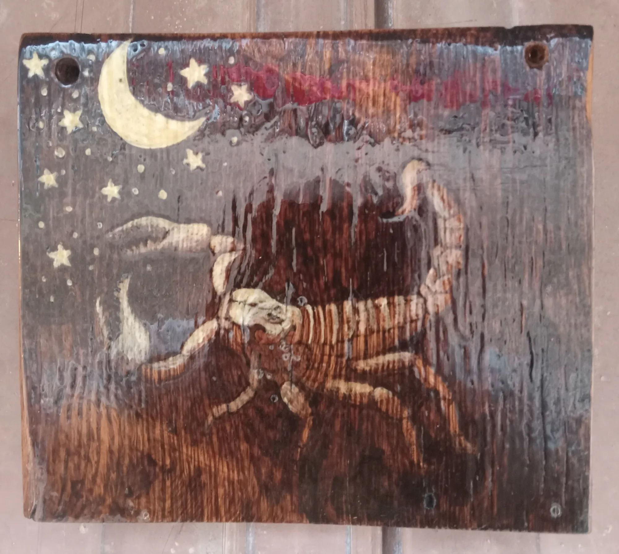 All original hand burned then hand painted on a 8"x7" piece of 100+ year old oak barn board. Super high gloss finish, wall hanging hardware is installed.