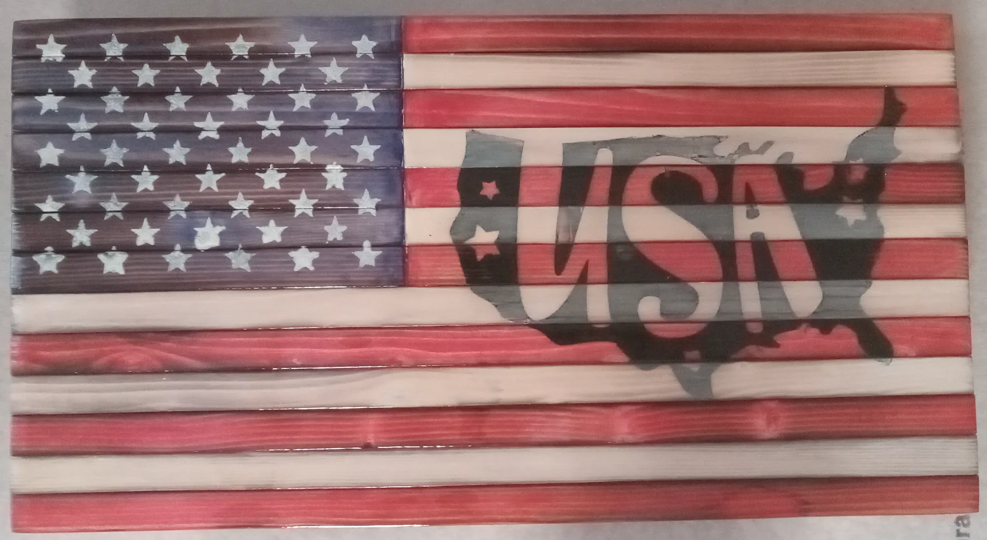 American flag with USA burned into the wood and a painted on 50 star union. It measures 15" x 8" and has a glossy finish. Hanging hardware has been installed.