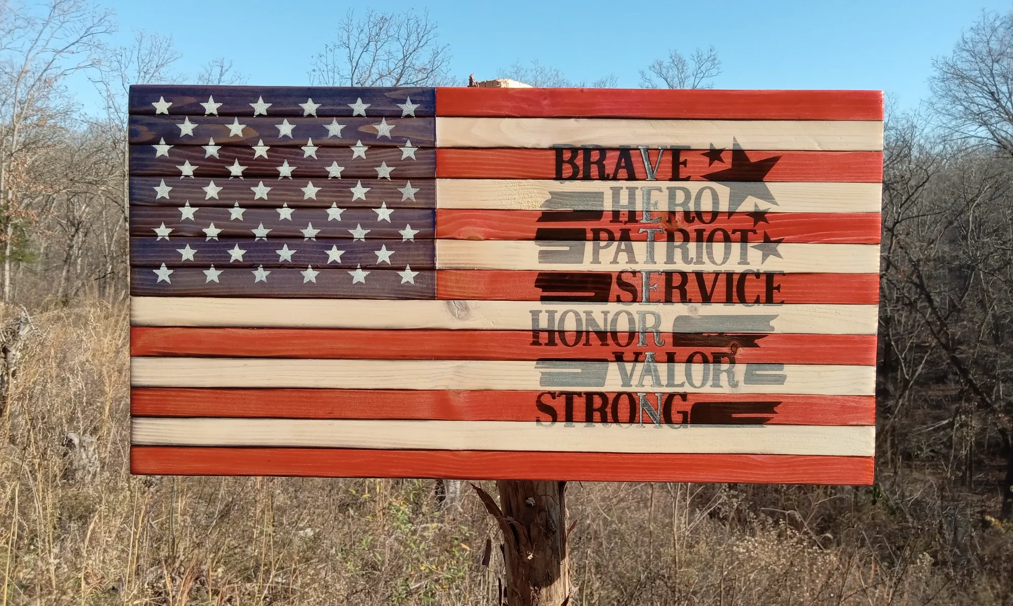 American flag with veteran art burned into the wood and a painted on 50 star union. It measures 21" x 11" and has a glossy finish. Hanging hardware has been installed.