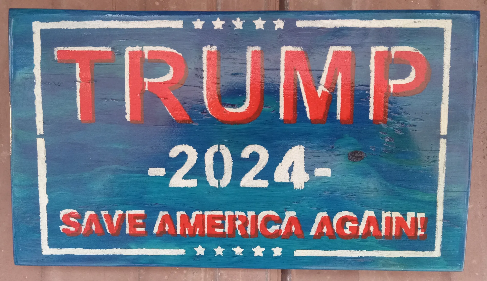Trump sign, white and red paint on blue stained 1/2" plywood 7"x13". Glossy finish and hanging hardware installed.
