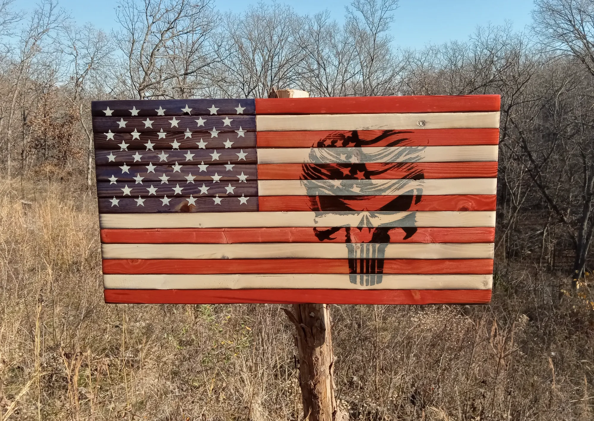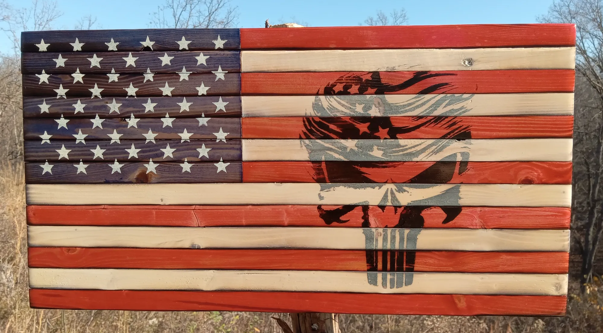 American flag with Punisher burned into the wood and a painted on 50 star union. It measures 21" x 11" and has a glossy finish. Hanging hardware has been installed.