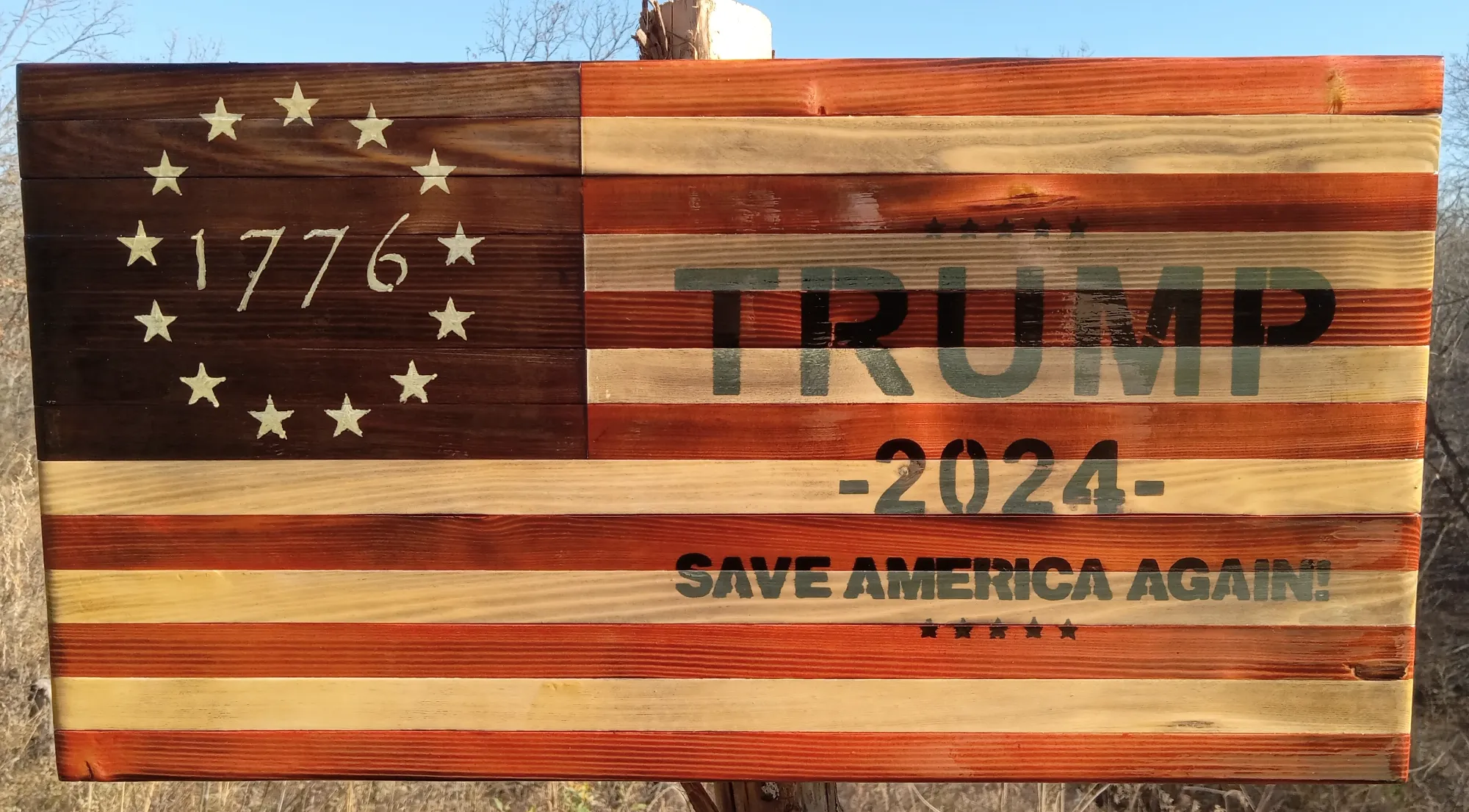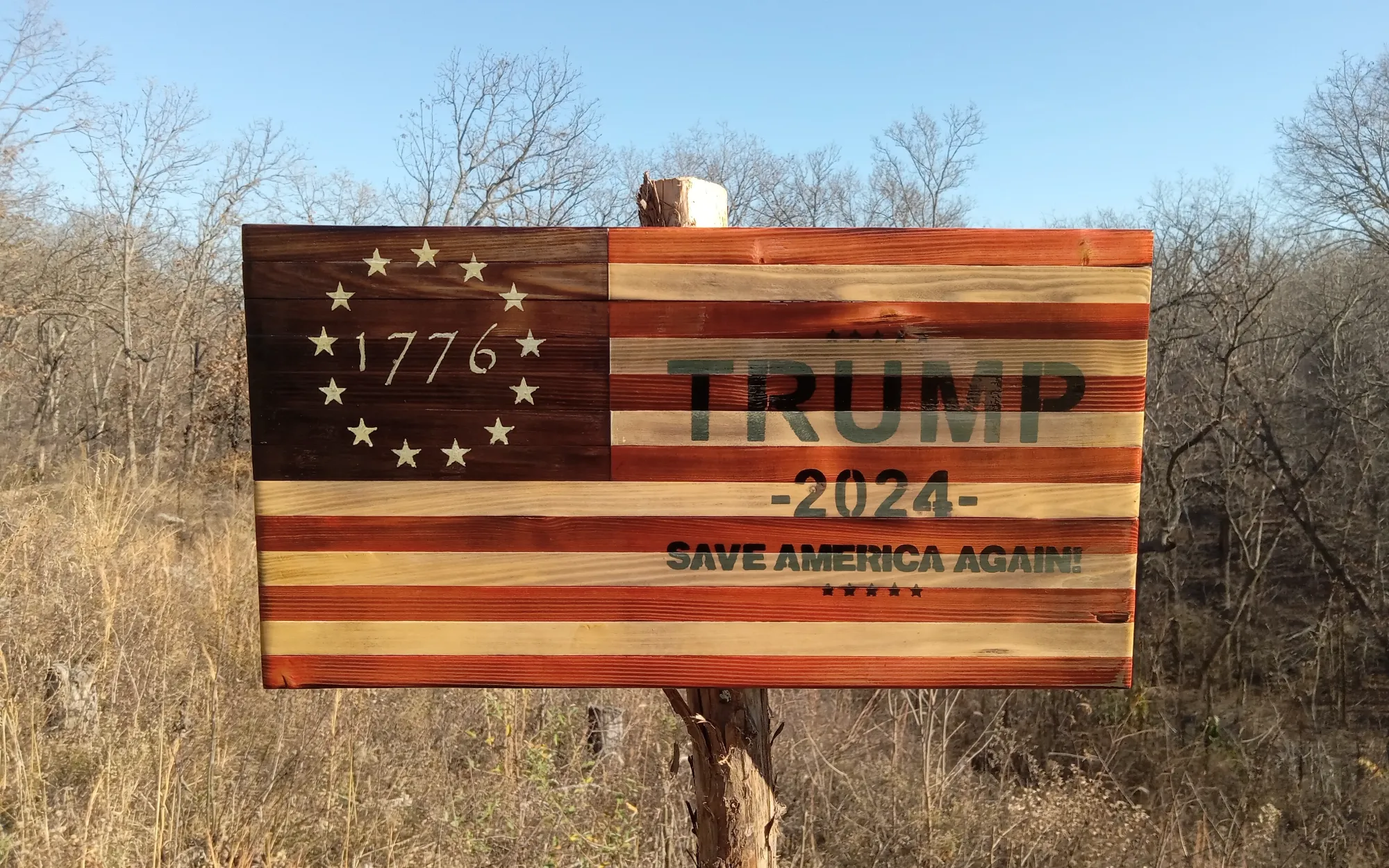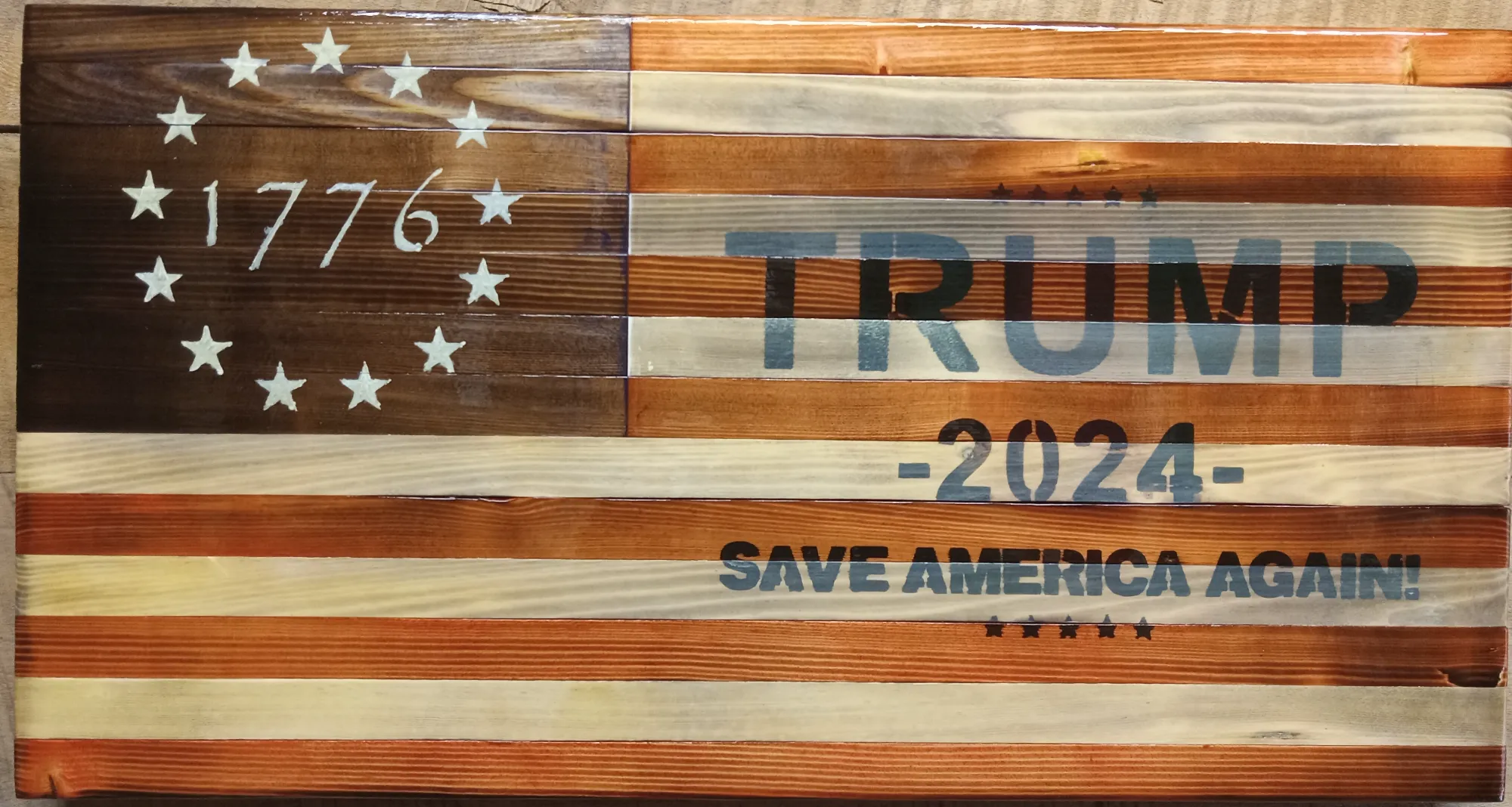 American flag with Trump -2024- burned into the wood and a painted on 50 star union. It measures 21" x 11" and has a glossy finish. Hanging hardware has been installed.